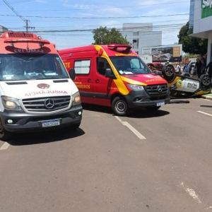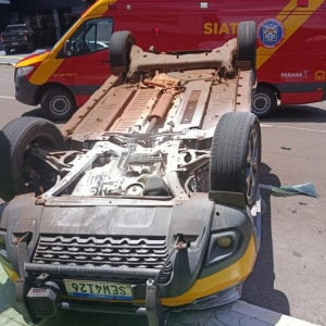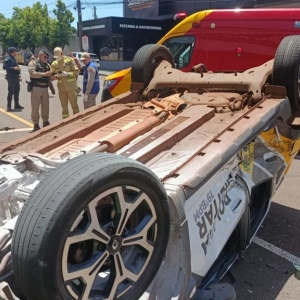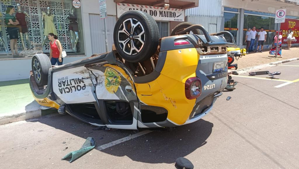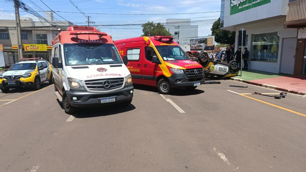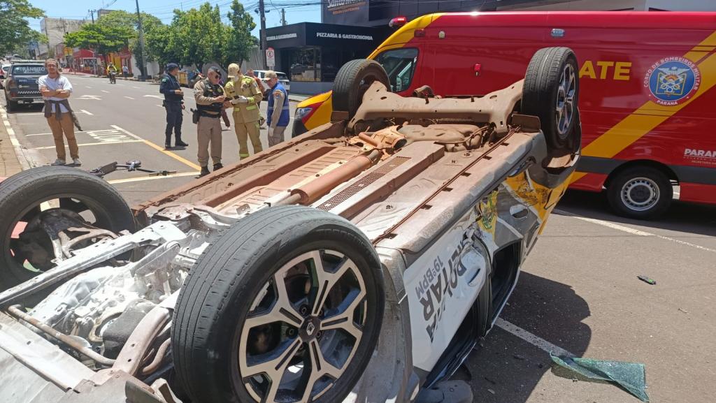 Um grave acidente mobilizou equipes de socorro nesta sexta-feira (24) em Toledo. A colisão, seguida de capotamento, envolveu uma viatura da Polícia Militar, uma caminhonete Ford F4000 e um patinete elétrico, na área central da cidade.