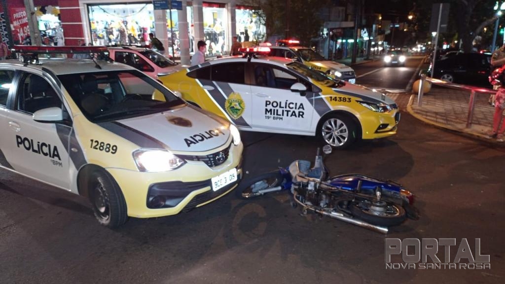Um moto Honda Biz de 100 cilindradas conduzida por um homem de 45 trafegava pela avenida Maripá e a viatura seguia pela rua Barão do Rio Branco e quando o policial que estava conduzindo viatura acessou avenida Maripá aconteceu a batida.