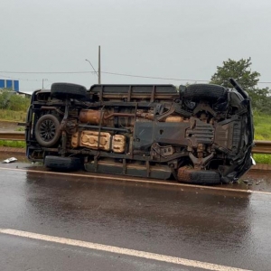 Uma viatura da Polícia Penal do Paraná se envolveu em um acidente no quilômetro 482 da BR-369, em Corbélia, durante a tarde desta sexta-feira (12). O veículo, uma caminhonete S10, seguia em deslocamento operacional quando acabou capotando e parando de lado na rodovia, ficando bastante danificado.