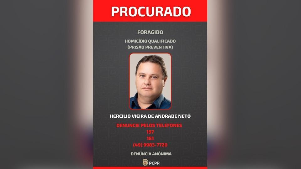 A Polícia Civil do Paraná procura Hercilio Vieira de Andrade Neto, vice-prefeito de Barracão, no Sudoeste do Paraná, reeleito em 2024, foragido desde que a Justiça decretou a prisão preventiva pelo crime de homicídio qualificado.