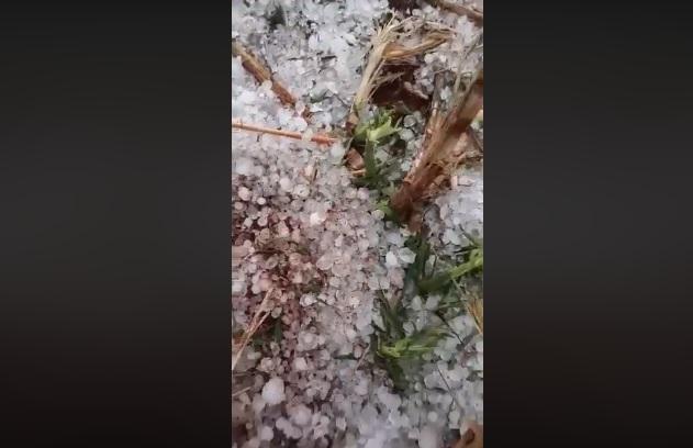 Em uma das imagens é possível ver a lavoura de milho quase que totalmente destruída pelas pedras de gelo. "Aqui na linha Rio da Prata quase 100% de perda da plantação", disse o agricultor ao ver o terreno coberto pelo granizo.