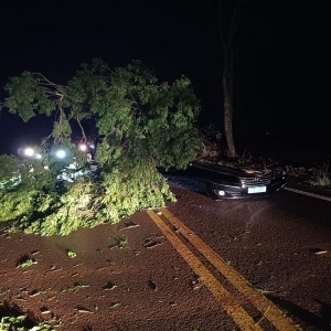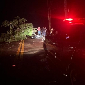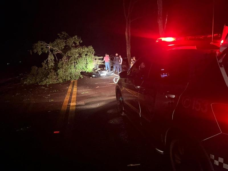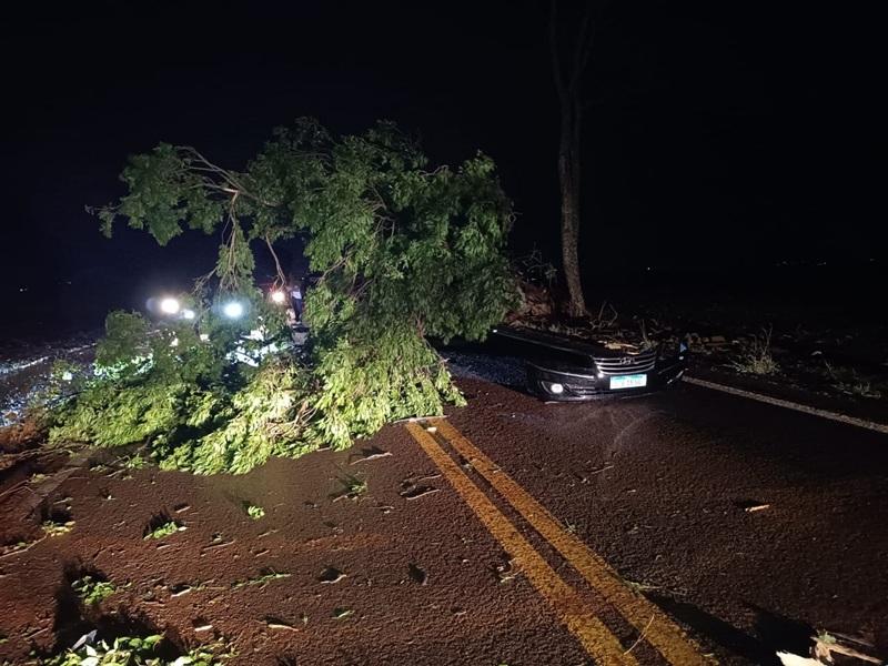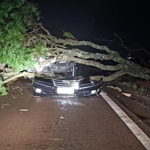 Um grave acidente foi registrado no início da noite deste sábado (20) na rodovia estadual PR-591, entre Vila Nova e Novo Sarandi em Toledo. Um veículo Hyundai Azera preto, de Toledo colidiu contra uma árvore de grande porte que havia caído sobre a pista durante a chuva forte.