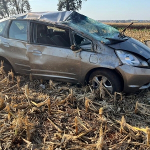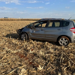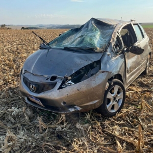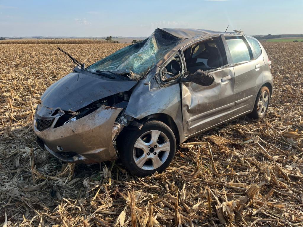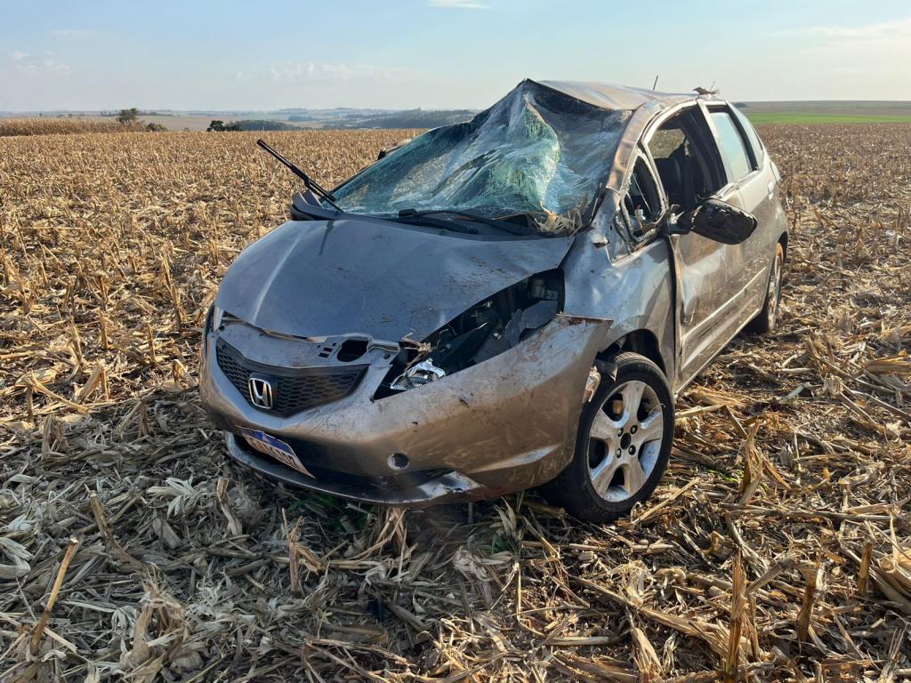O carro então subiu um barranco e entrou em uma lavoura, onde acabou capotando por alguns metros, parando na posição normal. O carro ficou destruído.