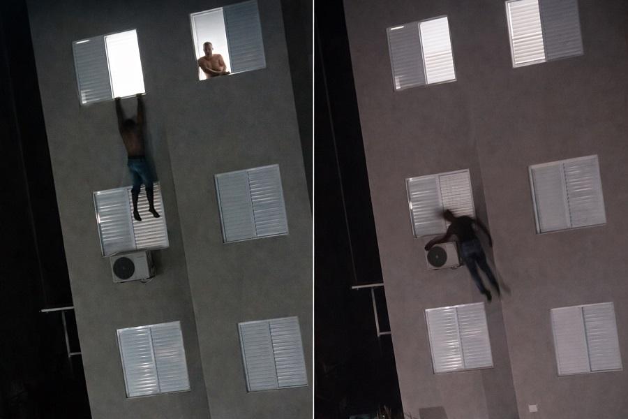 Imagens que circulam nas redes sociais mostram o instante em que o homem salta pela janela do terceiro andar. Durante a queda, ele atinge um aparelho de ar-condicionado instalado na fachada do edifício e, em seguida, se levanta e deixa o local caminhando.