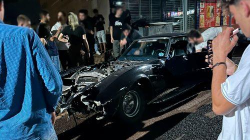 Com o impacto, pedaços do Corvette ficaram espalhados pelo asfalto. A parte dianteira do carro de luxo foi completamente destruída, com fumaça intensa e até fogo após a batida. Mesmo assim, o motorista ainda percorreu a avenida, subiu em um canteiro e voltou a realizar manobras como derrapagens e acelerações bruscas.