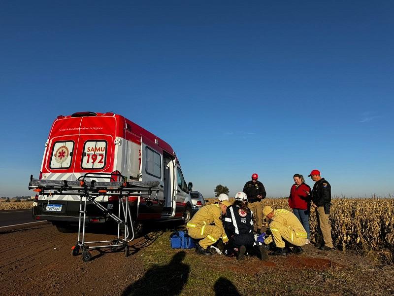 Uma ambulância do SAMU de Palotina foi acionada e prestou os primeiros socorros à vítima, que apresentava suspeita de fratura fechada em uma das pernas. O homem foi encaminhado para atendimento hospitalar em Palotina.