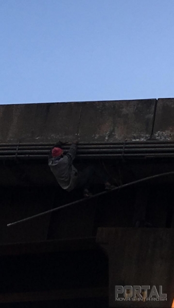 Ao perceber aproximação policial, o criminoso tentou iniciar manobra para subir novamente a ponte, quase caindo algumas vezes, mas conseguiu empreender fuga através da BR-163.