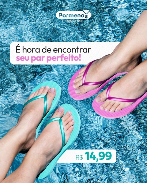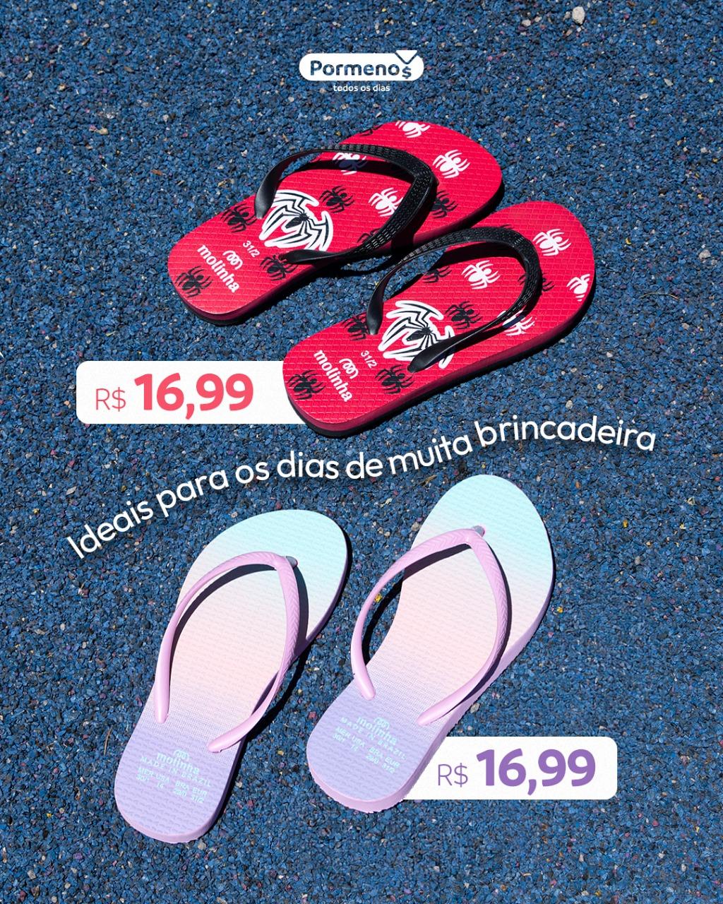 Além disso, está rolando o Festival de Chinelos - femininos por R$ 14,99 e masculinos por R$ 16,99.