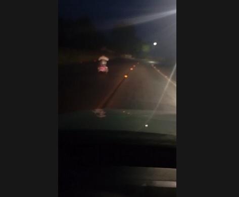 Além da direção perigosa, o momento em que o triciclo circulava aumenta o risco: visibilidade reduzida, ausência de iluminação adequada no local e comportamento completamente fora das normas de trânsito.