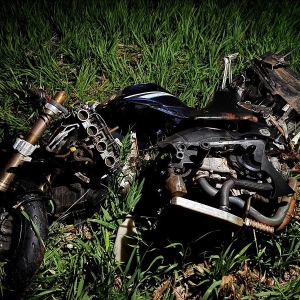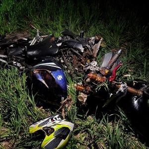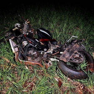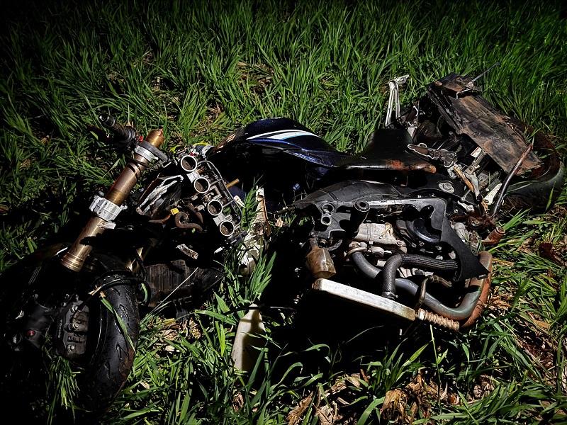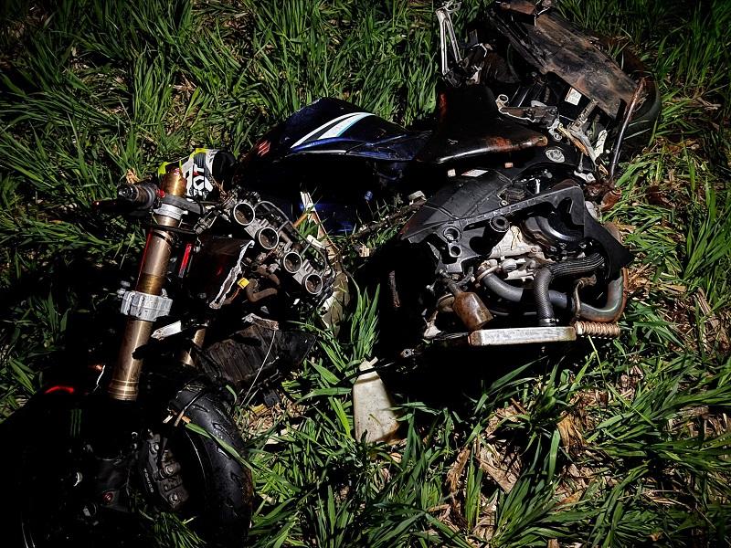 O segundo motociclista também deixou a pista, mas não se feriu. A Suzuki de alta cilindrada que ele conduzia ficou completamente destruída, com o motor e a estrutura rompidos ao meio, tornando o veículo irreconhecível.