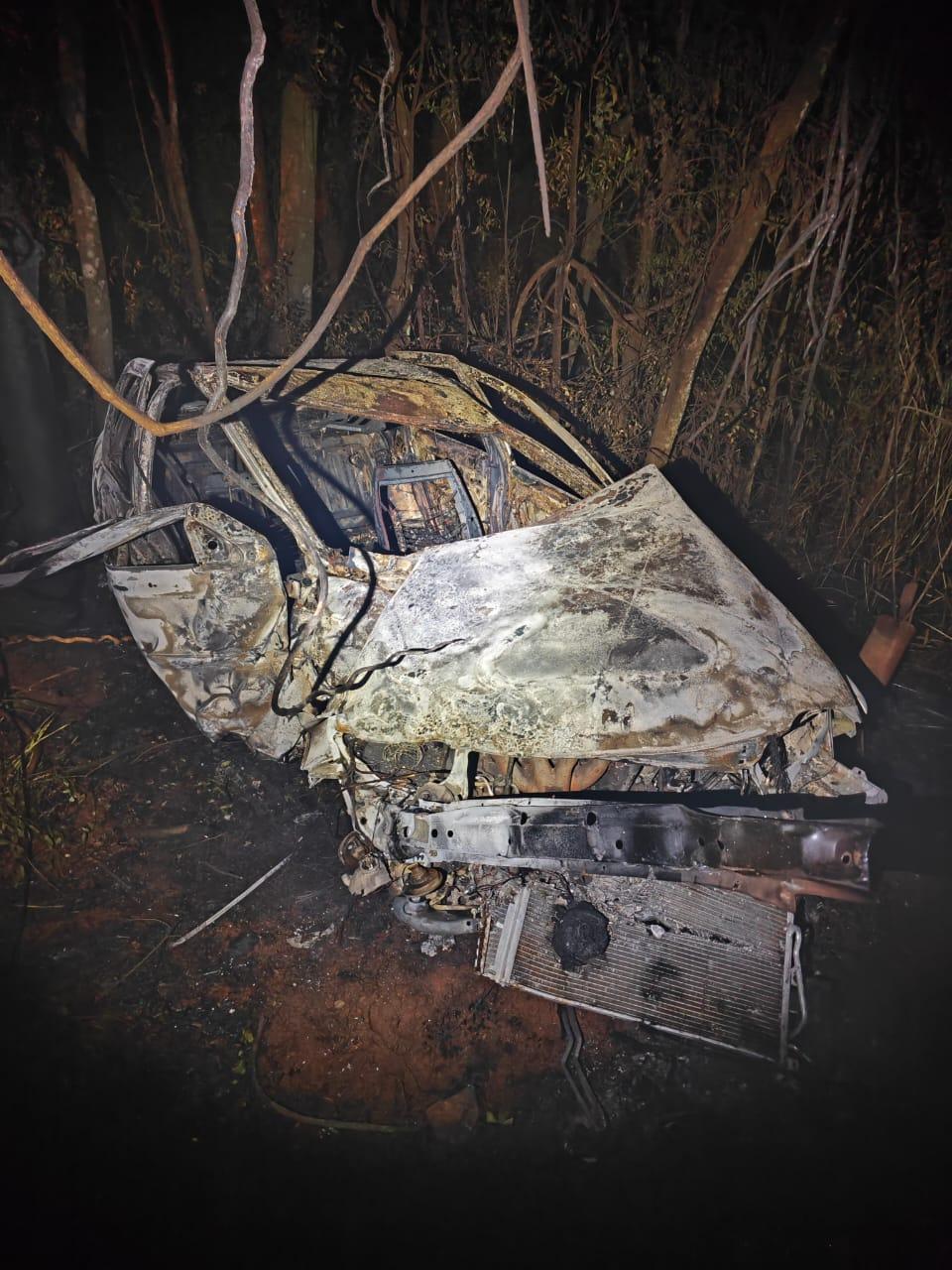Após a colisão, o carro incendiou e ficou destruído. As chamas foram contidas por uma equipe da Defesa Civil.