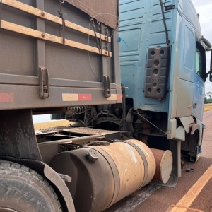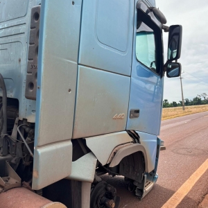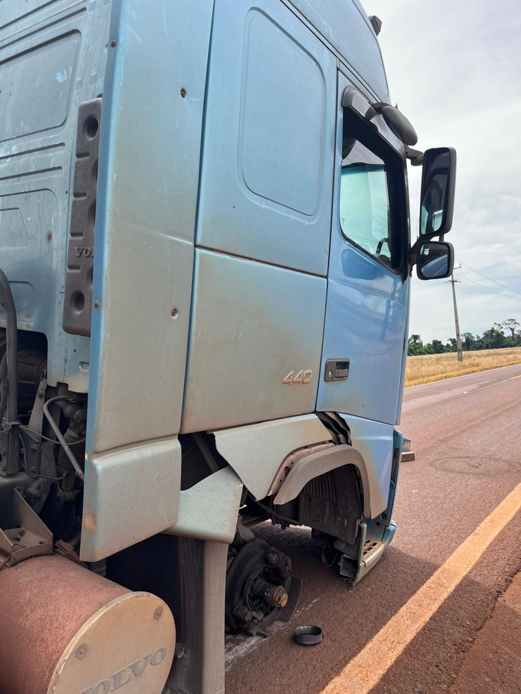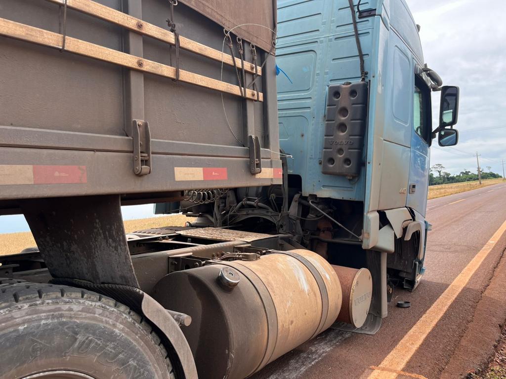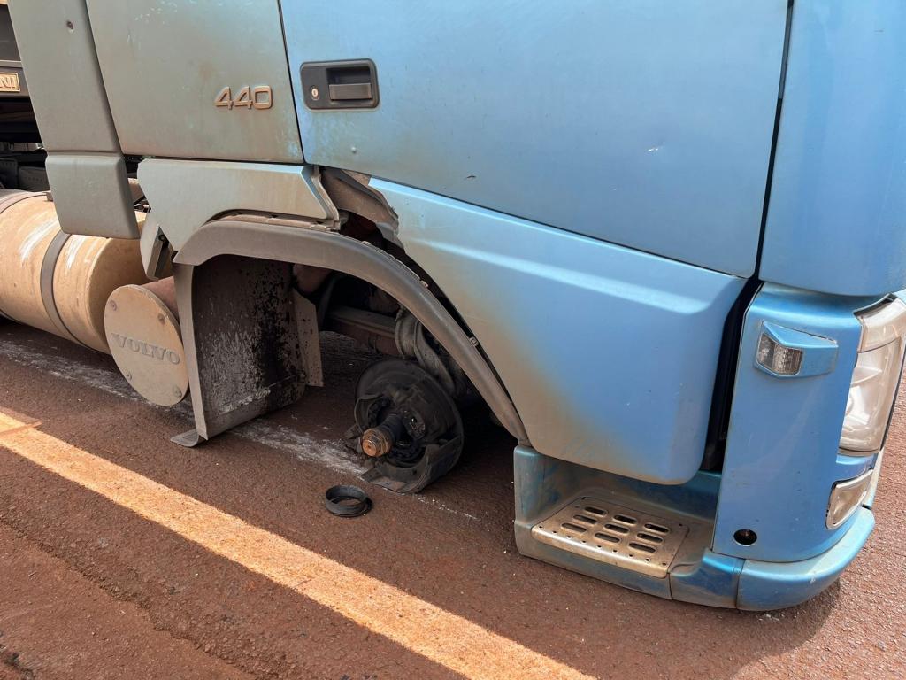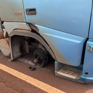 Na tarde desta quinta-feira, rodovia PR 589, em Nova Santa Rosa, proximidades da entrada que dá acesso ao distrito de Vila Cristal, sentido a Novo Sarandi em Toledo, um caminhão Volvo apresentou problemas mecânicos e ficou parado no meio da pista, a roda dianteira direita quebrou.