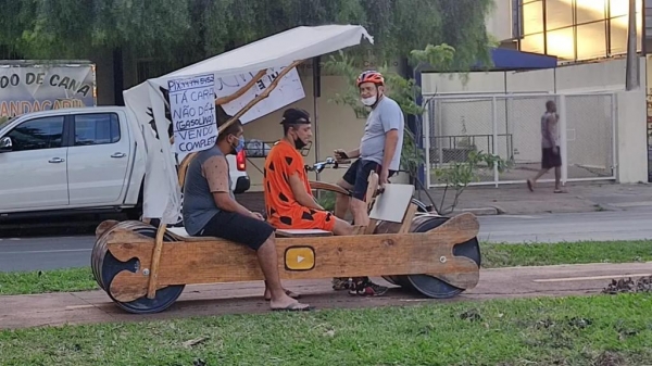 Vídeo de dois rapazes trafegando com um carro dos "Flintstones" em Maringá, está circulando nas redes sociais e viralizou. O flagrante foi registrado na Avenida Mandacaru.