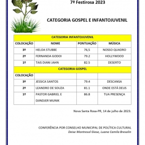 Na sexta-feira (14) e sábado (15) foi realizado no Teatro Municipal Gustavo Fischer o 7° Festirosa – Festival de Vozes de Nova Santa Rosa. No evento realizado pela Prefeitura através da Secretaria de Educação e Cultura se apresentaram os talentos locais do município, acompanhados da banda Sonata.