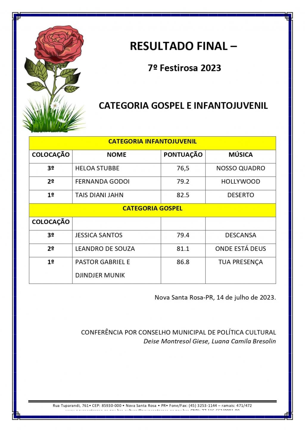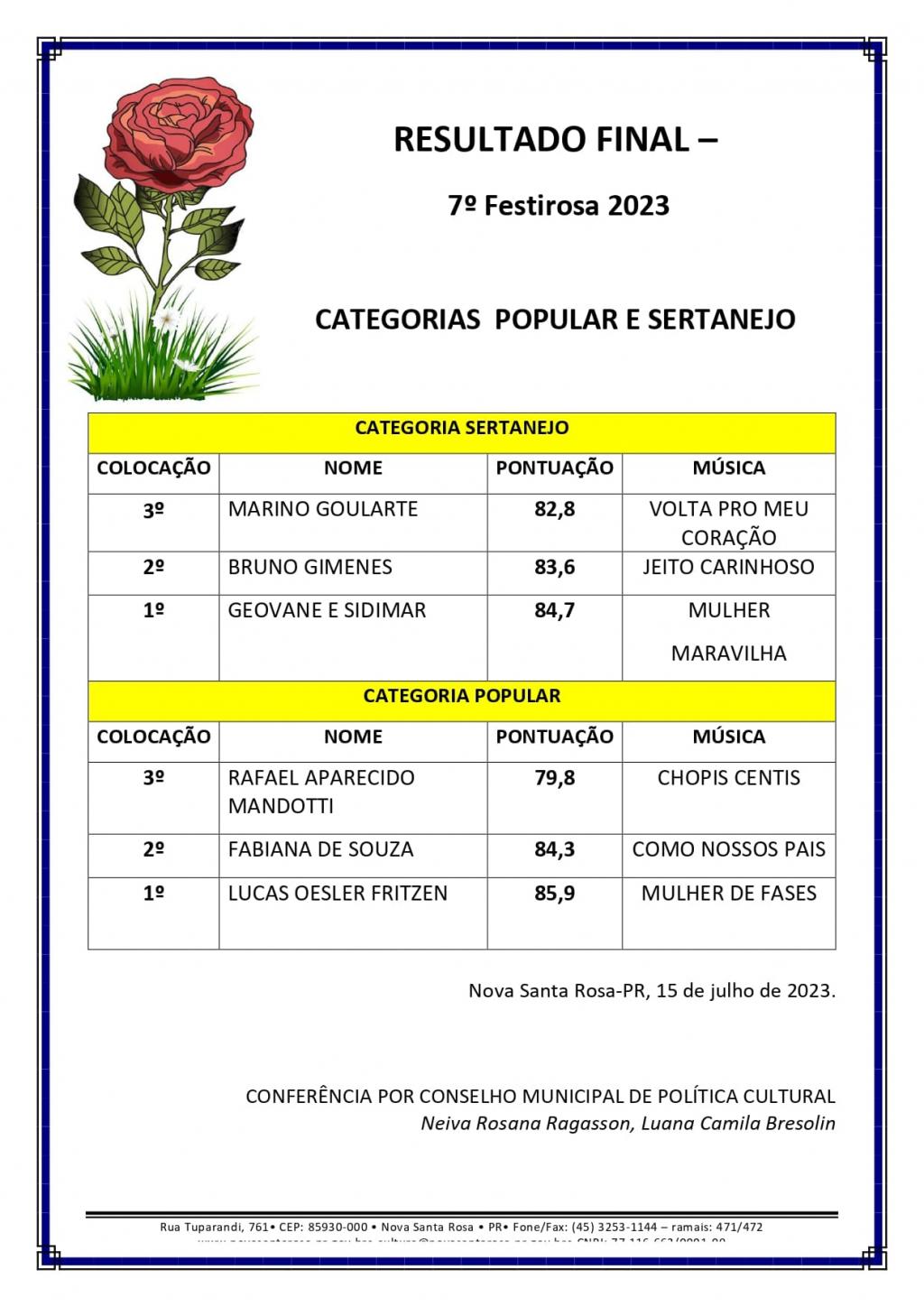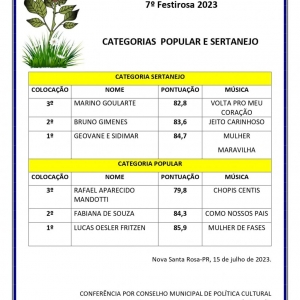 O Festival de Vozes de Nova Santa Rosa teve premiação em quatro categorias musicais: Sertanejo, Gospel, Popular e Infantojuvenil. Os primeiros colocados de cada categoria se classificaram para o Fermop – Festival Regional dos Municípios do Oeste do Paraná.