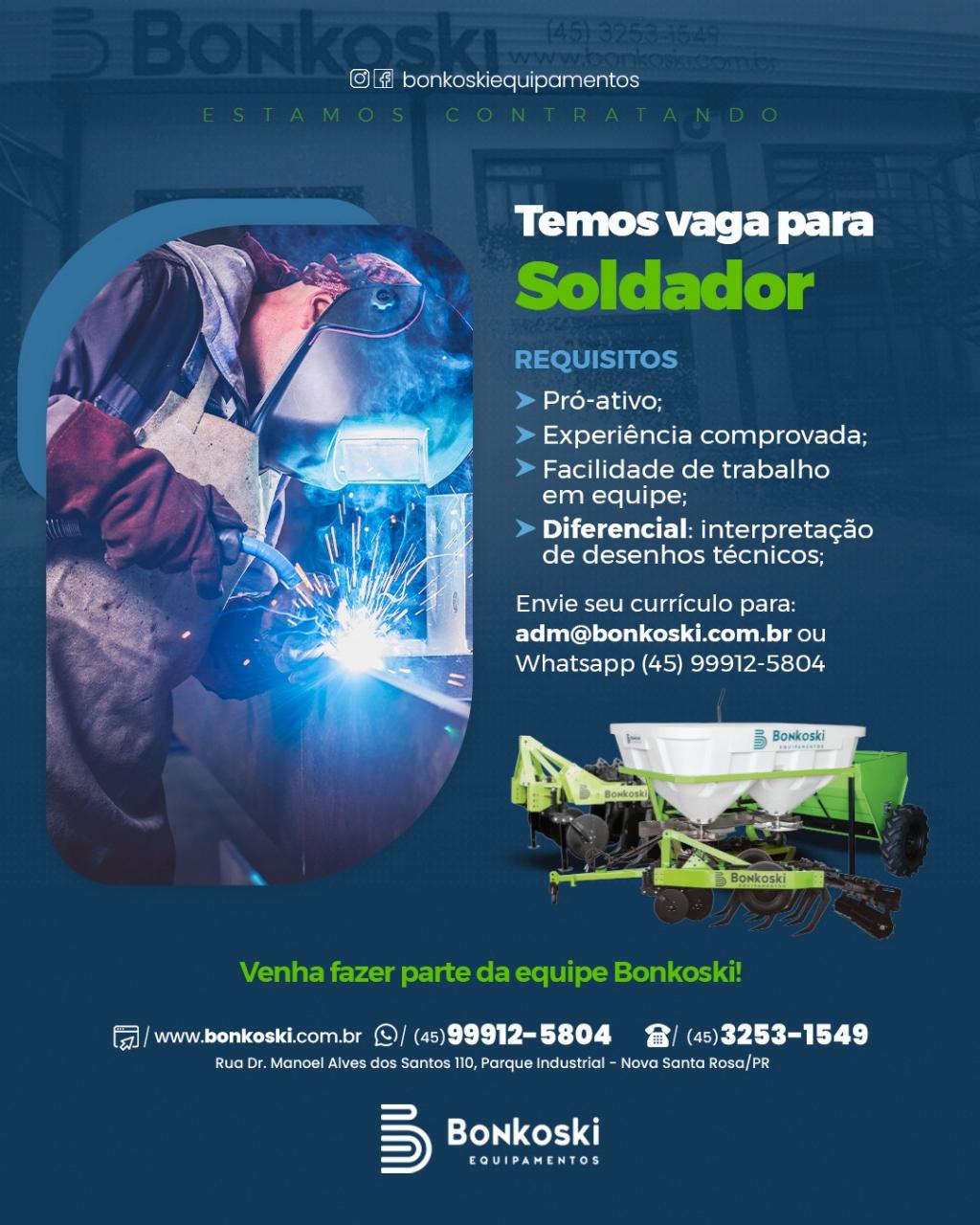 Bonkoski Equipamentos de Nova Santa Rosa está com vaga para soldador.