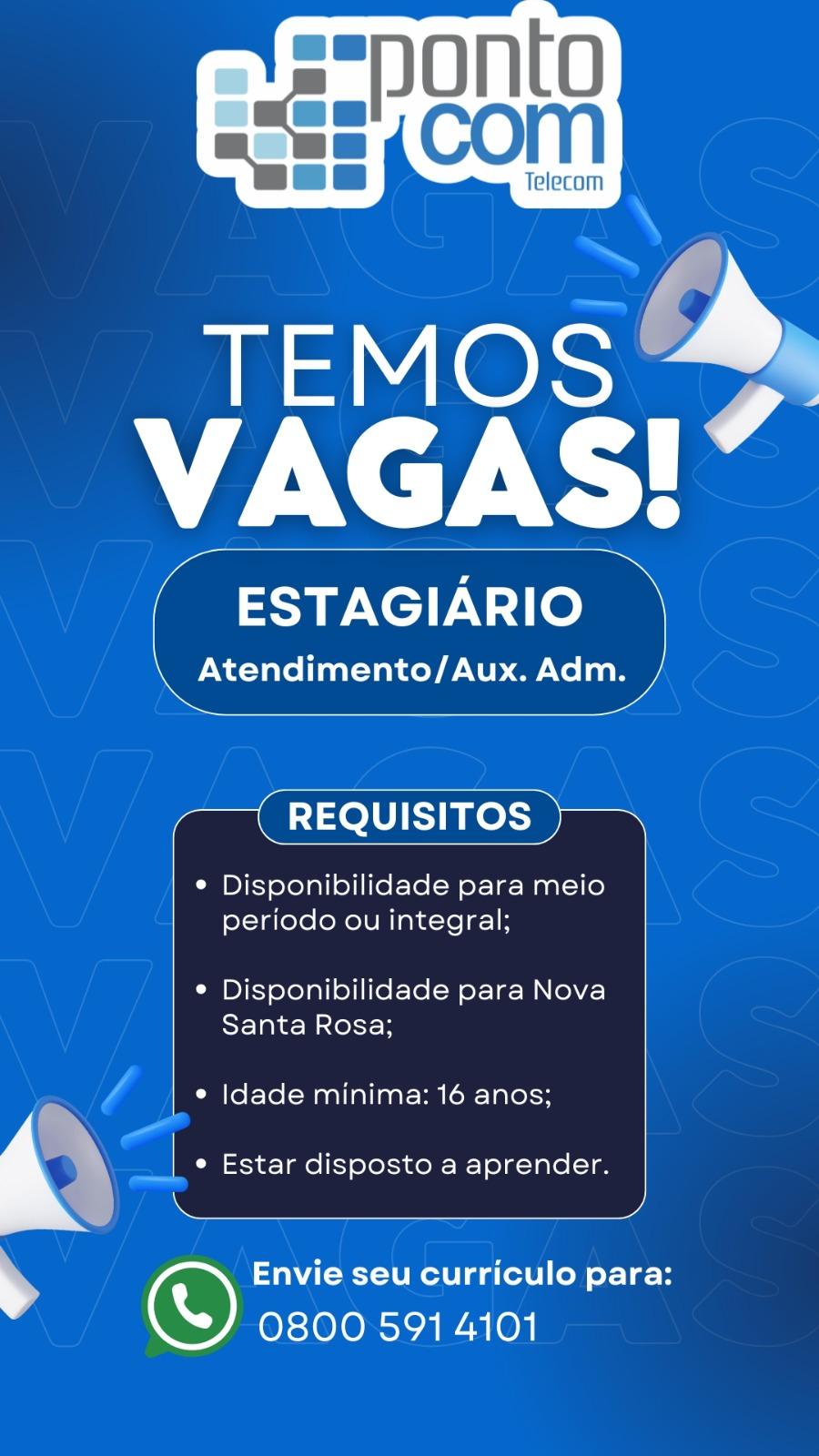 A Pontocom Telecom abre uma oportunidade de trabalho para Nova Santa Rosa na função de estagiário.