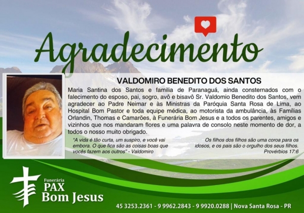 Maria Santina dos Santos e familia de Paranaguá, ainda consternados com o falecimento do esposo, pai, sogro, avô e bisavô Sr. Valdomio Benedito dos Santos, vem agradecer ao Padre Neimar e às Ministras da Paróquia Santa Rosa de Lima, ao Hospital Bom Pastor e toda equipe médica, ao motorista da ambulância, às Famílias Orlandin, Thomas e Camarões, à Funerária Bom Jesus e a todos os parentes, amigos e vizinhos que nos mandaram flores e uma palavra de consolo neste momento de dor, a todos o nosso muito obrigado.