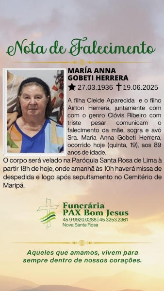 A filha Cleide Aparecida e o filho Airton Herrera, juntamente com com o genro Clóvis Ribeiro com triste pesar comunicam o falecimento da mãe, sogra e avó Sra. Maria Anna Gobeti Herrera, ocorrido hoje (19), aos 89 anos de idade.