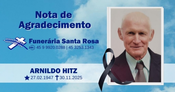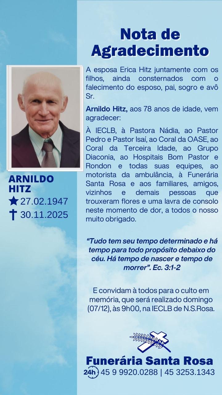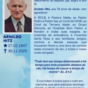 A esposa Erica Hitz juntamente com os filhos, ainda consternados com o falecimento do esposo, pai, sogro e avô Sr. Arnildo Hitz, vem agradecer à IECLB, à Pastora Nádia, ao Pastor Pedro e Pastor Isaí, ao Coral da OASE, ao Coral da Terceira Idade, ao Grupo Diaconia, ao Hospitais Bom Pastor e Rondon e todas suas equipes, ao motorista da ambulância, à Funerária Santa Rosa e aos familiares, amigos, vizinhos e demais pessoas que trouxeram flores e uma lavra de consolo neste momento de dor, a todos o nosso muito obrigado.
