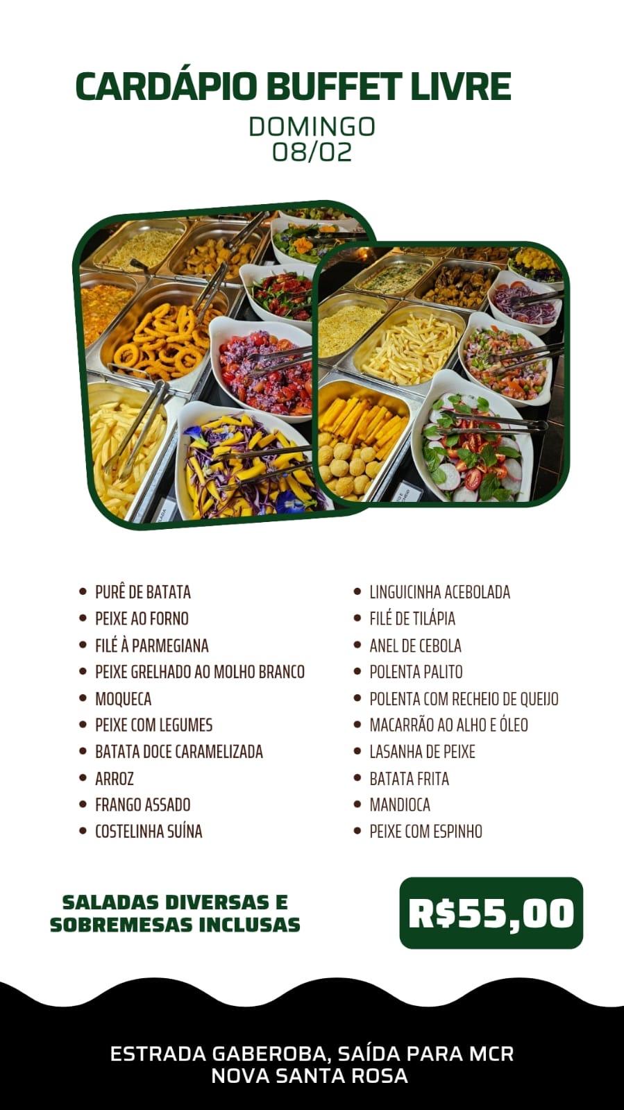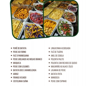 No cardápio você encontra delícias como: Purê de batata; Peixe ao forno e peixe grelhado ao molho branco; Filé à parmegiana; Moqueca e peixe com legumes; Batata doce caramelizada, arroz e frango assado; Costelinha suína e linguicinha acebolado; Filé de tilápia e lasanha de peixe; Macarrão ao alho e óleo; Polenta palito e polenta recheada com queijo; Anel de cebola, batata frita e mandioca; Peixe com espinho.