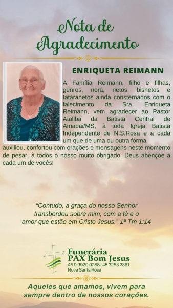 A Família Reimann, filho e filhas, genros, nora, netos, bisnetos e tataranetos ainda consternados com o falecimento da Sra. Enriqueta Reimann, vem agradecer ao Pastor Ataliba da Batista Central de Amabai/MS, à toda Igreja Batista Independente de N.S.Rosa e a cada um que de uma ou outra forma auxiliou, confortou com orações e mensagens neste momento de pesar, à todos o nosso muito obrigado. Deus abençoe a cada um de vocês!