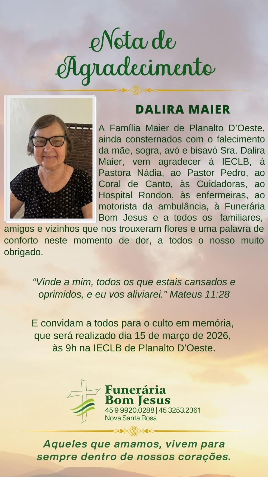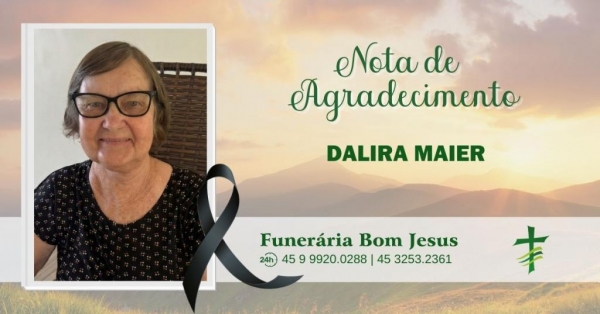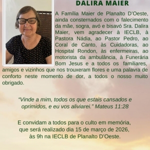 A Família Maier de Planalto D'Oeste, ainda consternados com o falecimento da mãe, sogra, avó e bisavó Sra. Dalira Maier, vem agradecer à IECLB, à Pastora Nádia, ao Pastor Pedro, ao Coral de Canto, às Cuidadoras, ao Hospital Rondon, às enfermeiras, ao motorista da ambulância, à Funerária Bom Jesus e a todos os familiares, amigos e vizinhos que nos trouxeram flores e uma palavra de conforto neste momento de dor, a todos o nosso muito obrigado.