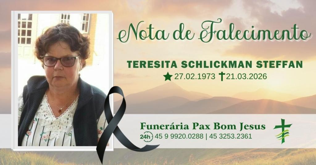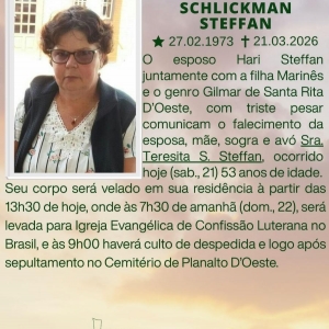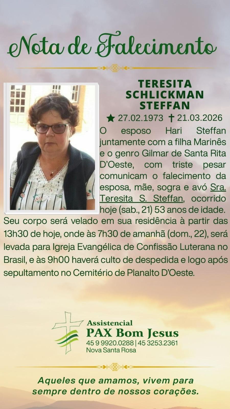 O esposo Hari Steffan juntamente com a filha Marinês e o genro Gilmar de Santa Rita D’Oeste, com triste pesar comunicam o falecimento da esposa, mãe, sogra e avó Sra. Teresita S. Steffan, ocorrido hoje (21) 53 anos de idade.