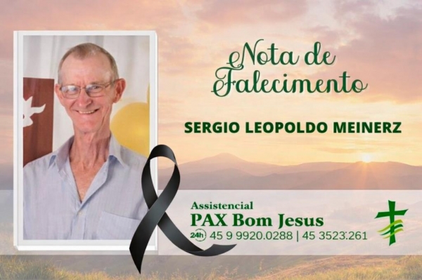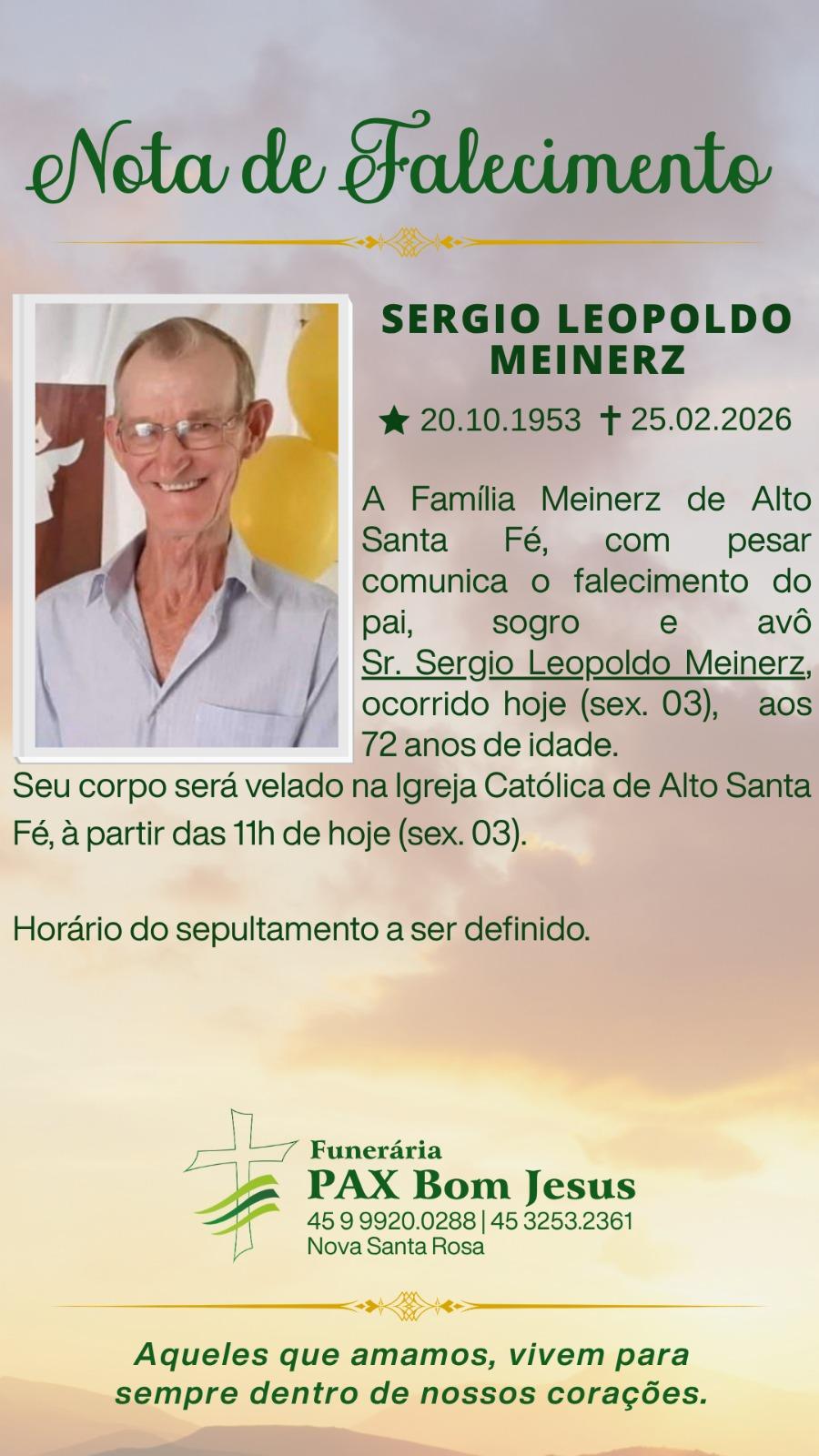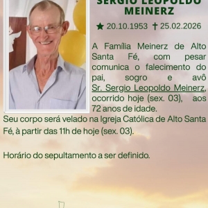 A Família Meinerz de Alto Santa Fé, com pesar comunica o falecimento do pai, sogro e avô Sr. Sergio Leopoldo Meinerz, ocorrido hoje (03), aos 72 anos de idade.