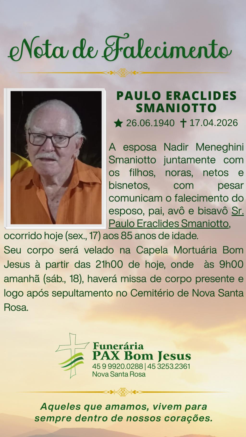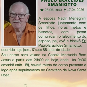 A esposa Nadir Meneghini Smaniotto, juntamente com os filhos, noras, netos e bisnetos, com pesar comunica o falecimento do esposo, pai, avô e bisavô Sr. Paulo Eraclides Smaniotto, ocorrido hoje (sex., 17) aos 85 anos de idade.
