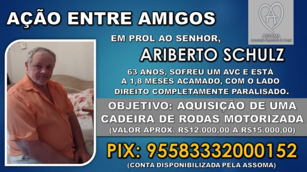 O Senhor Ariberto Schulz, morador de Maripá sofreu um AVC e está a um ano e oito meses acamado, com lado direito completamente paralisado.