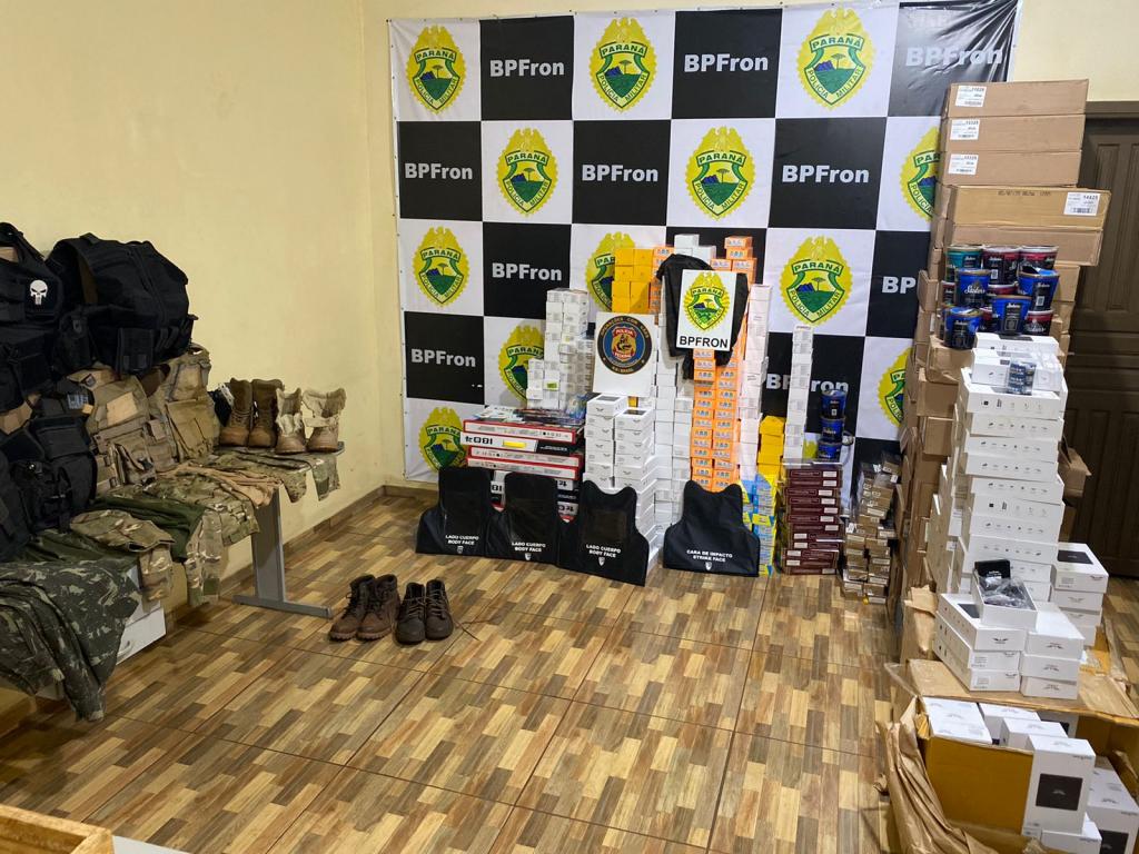 Foram apreendidos placas e coletes balísticos, fardas e identificações de polícia, diversos produtos contrabandeados, cinco carregadores de pistola, 76 munições intactas, uma porção de substância análoga a maconha, um veículo com giroflex semelhante ao usado pela polícia e outro veículo, ambos com alerta de roubo.
