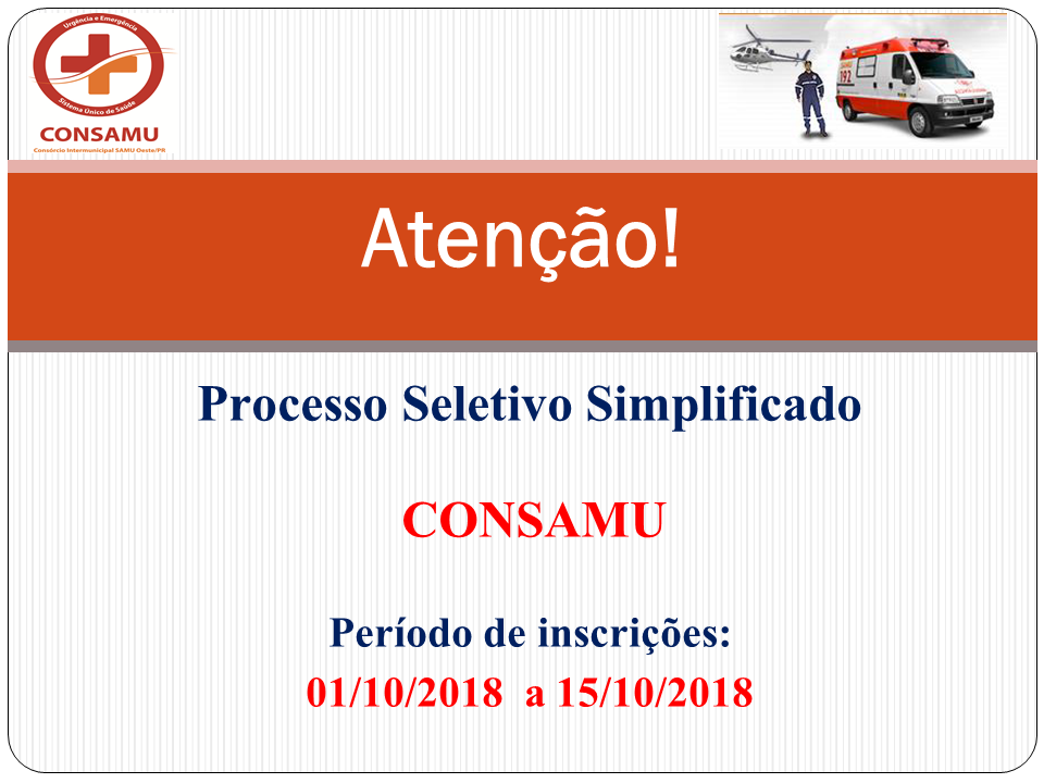 As inscrições para o Processo Seletivo Simplificado (PSS) do CONSAMU (Consórcio Intermunicipal Samu Oeste) iniciam na próxima segunda-feira (01). O presente processo destina-se à contratação temporária para o preenchimento de vagas em emprego público, além da formação de cadastro reserva. O critério utilizado para a escolha dos candidatos será unicamente a avaliação curricular de experiência profissional e títulos.