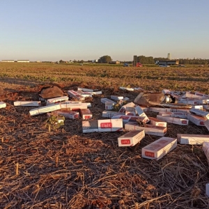 A Policia Rodoviária Federal apreendeu, na tarde de hoje (29) 22.500 maços de cigarros contrabandeados transportados em uma Santa Fé roubada. O condutor desobedeceu a tentativa de abordagem na BR 467, em Toledo, e empreendeu fuga em alta velocidade.
