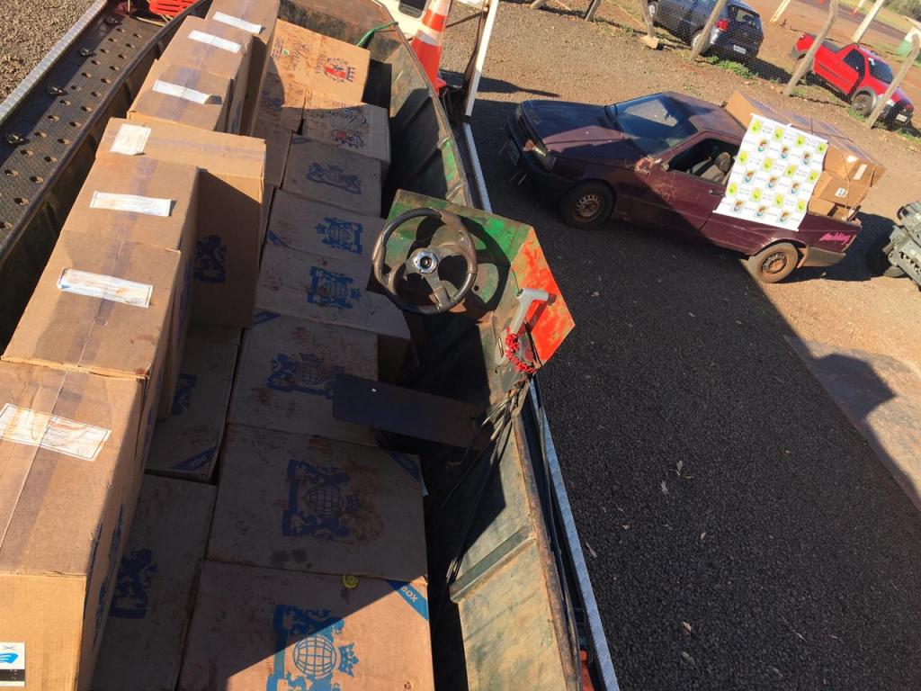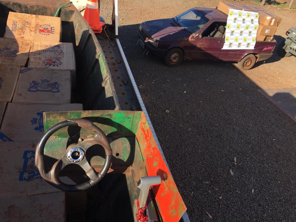 No local foram apreendidos um veículo Fiat e uma embarcação com cerca de 70 caixas de cigarros de origem paraguaia, um prejuízo estimado de R$ 200.000,00 para a organização criminosa.