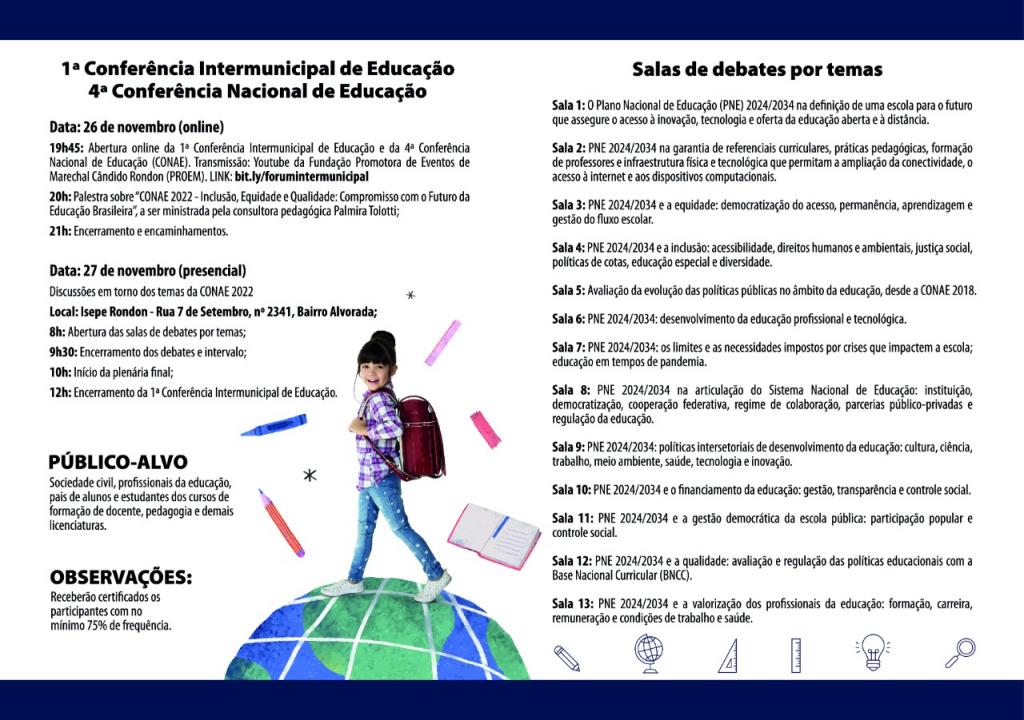 Nesta sexta-feira, dia 26, as atividades serão online através do Canal da PROEM (Fundação Promotora de Eventos de Marechal Cândido Rondon) no Youtube. A programação inicia às 19h45, com a abertura online e em seguida haverá uma palestra sobre “CONAE 2022- Inclusão, Equidade e Qualidade: Compromisso com o Futuro da Educação Brasileira”, a ser ministrada pela consultora pedagógica Palmira Tolotti.