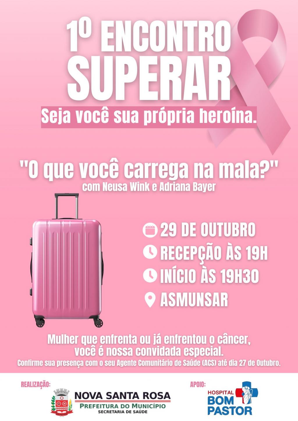 Nesta quarta-feira (29), nas dependências da Asmunsar, será realizado o 1º Encontro Superar, com o tema “Seja você a sua própria heroína!”. O evento é uma realização da Prefeitura de Nova Santa Rosa, por meio da Secretaria de Saúde, em parceria com o Hospital Bom Pastor.
