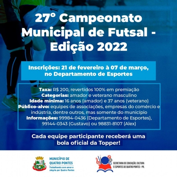 Na sua 27ª edição, o Campeonato Municipal de Futsal - Edição 2022, categorias amador e veterano masculino, está com as inscrições abertas em Quatro Pontes. Eles seguem até o dia 07 de março e devem ser realizadas no Departamento de Esportes, organizador da competição, junto ao Centro Poliesportivo Seno José Lang. A taxa de inscrição é de R$ 200 por equipe, valor que será revertido em premiação. Cada equipe participante também receberá uma bola oficial da Topper.