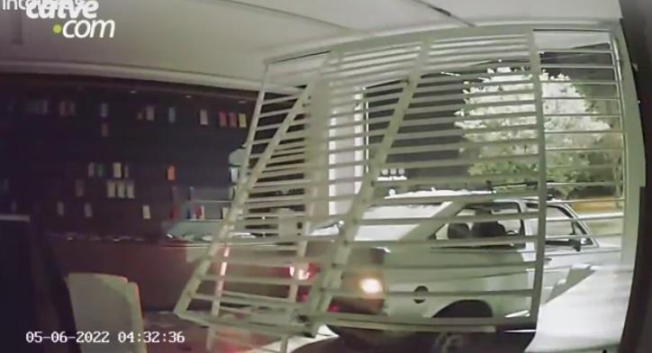 Dois suspeitos param em frente a loja e na sequência um Volkswagen Gol em marcha à ré destrói a vidraça e também a grade de proteção.