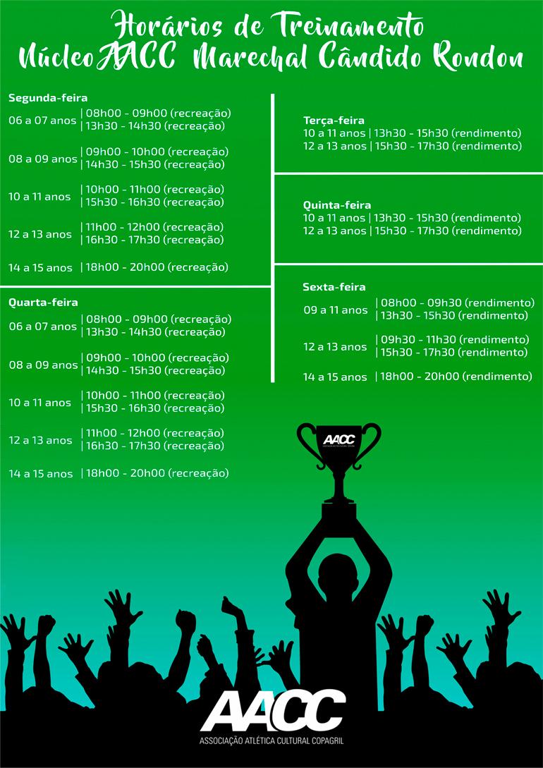A Associação Atlética Cultural Copagril (AACC) retomará na próxima segunda-feira (10) os treinos de futsal para crianças de 06 a 15 anos no município de Marechal Cândido Rondon. O projeto social de treinos de futsal atende crianças de forma gratuita, sendo como requisito para participação estarem matriculados e frequentando a escola.