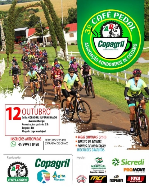 No próximo dia 12, a ARC (Associação Rondonense de Ciclismo) e os Supermercados Copagril, realizam a 3ª edição do Café Pedal. O evento, que integra a programação do 6º Agita Rondon, recebe os apoios da prefeitura de Marechal Cândido Rondon, Sicredi, Bicicletaria Lirio, MCR Bikes, Refran Bikes, Yeia Motos & Bikes e Promove Comunicação.