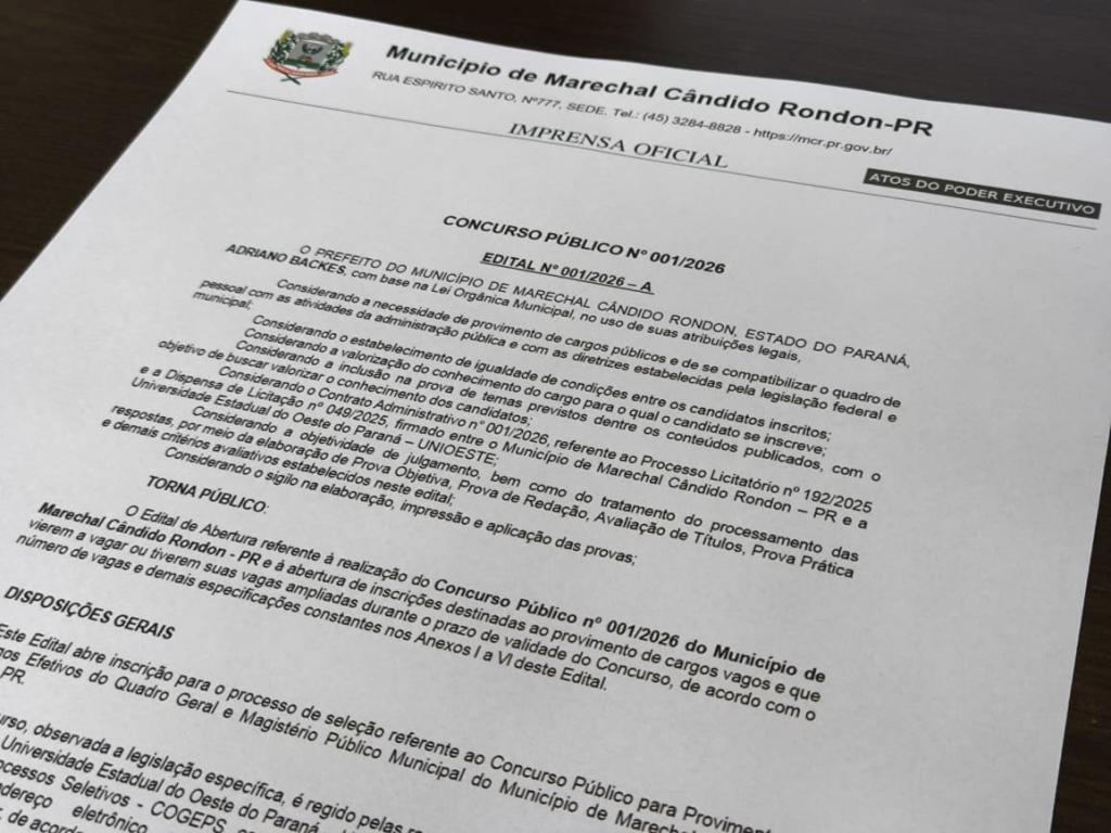Estão abertas as inscrições para o Concurso Público nº 001/2026 da prefeitura de Marechal Cândido Rondon. O certame é destinado ao preenchimento de vagas e também à formação de cadastro de reserva em diversas áreas da administração municipal.
