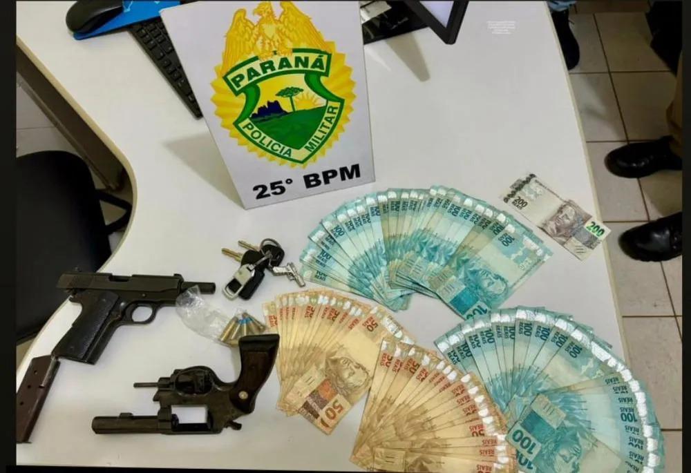 Durante a ação, foi apreendido um Revólver Taurus com seis munições, uma Pistola MD1 380 com três munições, R$ 6.650,00 e um veículo Ecosport com motor adulterado.