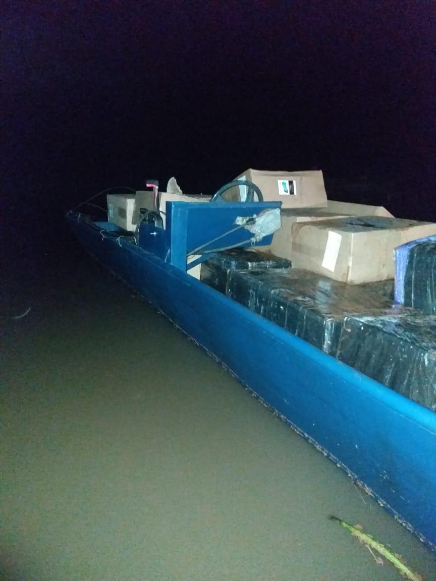 Na embarcação clandestina foram encontradas várias caixas de cigarros de origem paraguaia e diversos volumes de produtos importados ilegalmente.