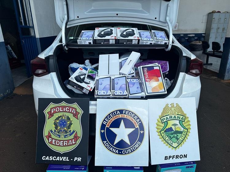 Na tarde desta quinta-feira (27), uma operação integrada entre a Polícia Federal de Cascavel, a Receita Federal e a Polícia Militar do Paraná, por meio do Batalhão de Fronteira (BPFron), resultou na apreensão de uma grande quantidade de eletrônicos e outros produtos de origem paraguaia.
