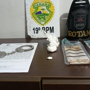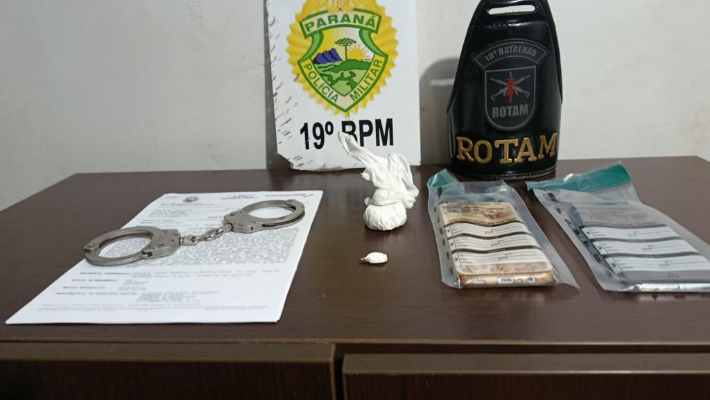A ação teve início após as equipes se deslocarem até o estabelecimento comercial para cumprir um mandado de prisão expedido pelo plantão judiciário da Comarca de Toledo. No local, os policiais avistaram um homem, de 27 anos, atrás do balcão manipulando um pequeno invólucro, que, ao perceber a presença das equipes, tentou se desfazer do objeto, jogando-o no chão.