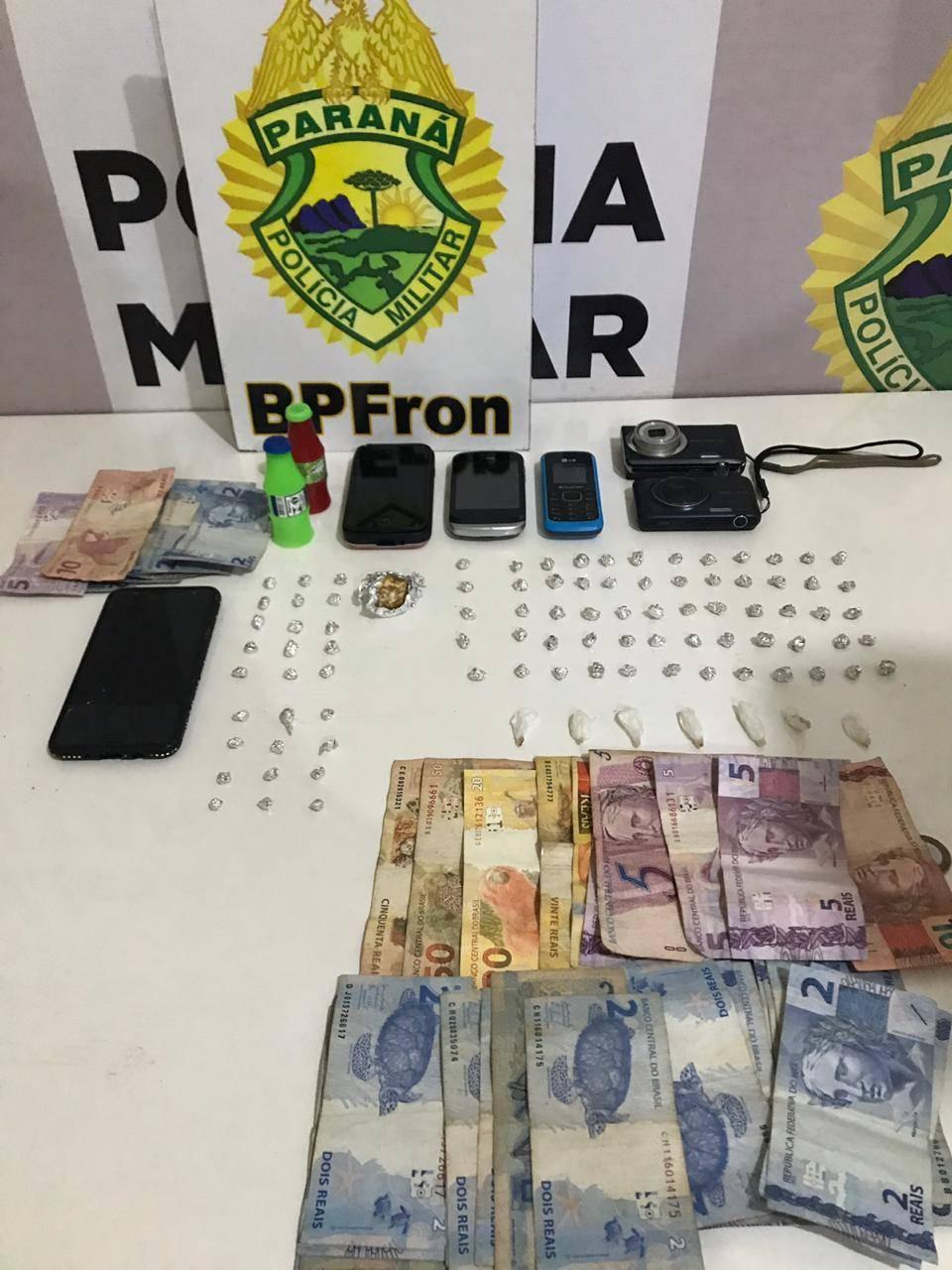 A equipe desconfiou da atitude deles na entrada de uma residência e em abordagem localizou porções de crack, cocaína, acessórios, celulares, câmeras digitais e R$ 288 em dinheiro.
