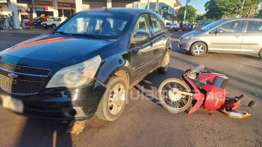 A colisão aconteceu no cruzamento da Avenida Rio Grande do Sul com a Rua Cabral, próximo ao DEPEN-Cadeia Pública, e envolveu uma motocicleta Honda Biz e um veículo Chevrolet Agile com placa do Paraguai.