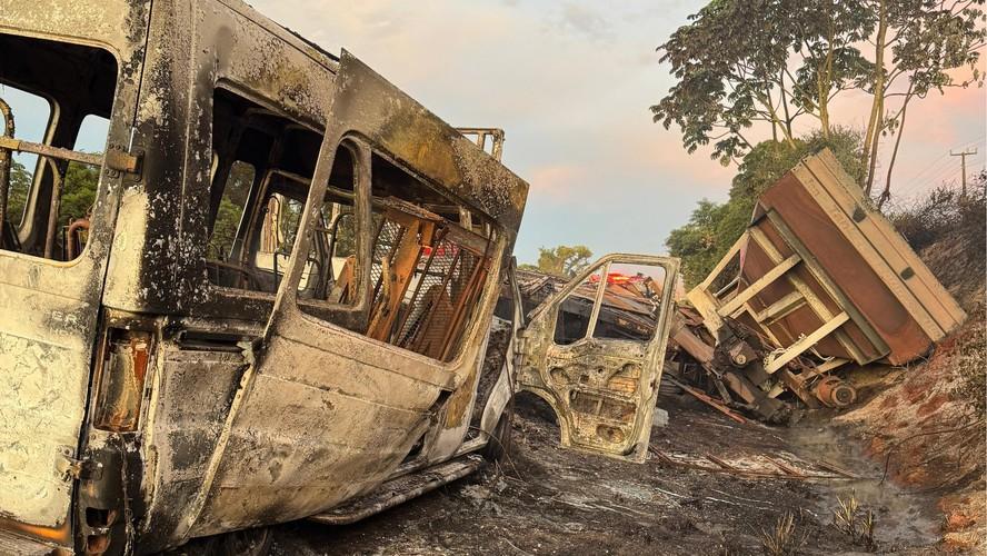 Um veículo pegou fogo e as chamas se alastraram. Imagens mostram os veículos destruídos pelo fogo.