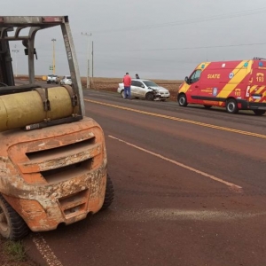 Um acidente foi registrado por volta das 8h00 desta quarta-feira na rodovia PR-239 no km 50, próximo ao trevo que dá acesso ao distrito de Ouro Preto e envolveu um veículo Volkswagen Voyage com placas da cidade de Assis Chateaubriand e uma máquina empilhadeira.
